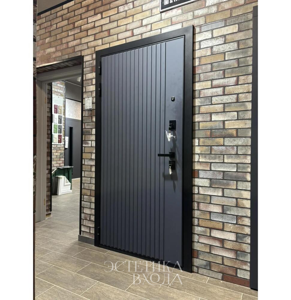Входная дверь Абсолют с огромным зеркалом для квартиры. Выполнена в современном стиле, с необычной фрезеровкой. Черная фурнитура добавляет максимализм этой модели. Образец установлен на Яснополянской 1.