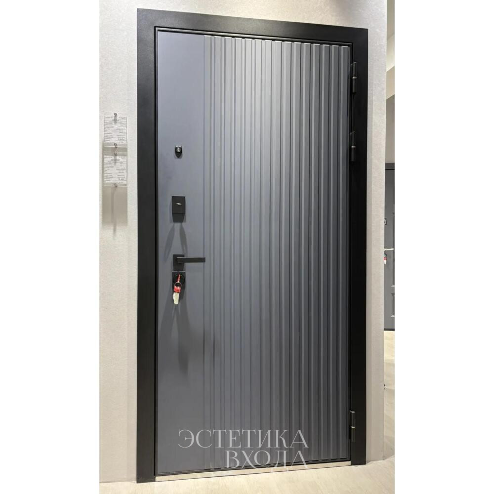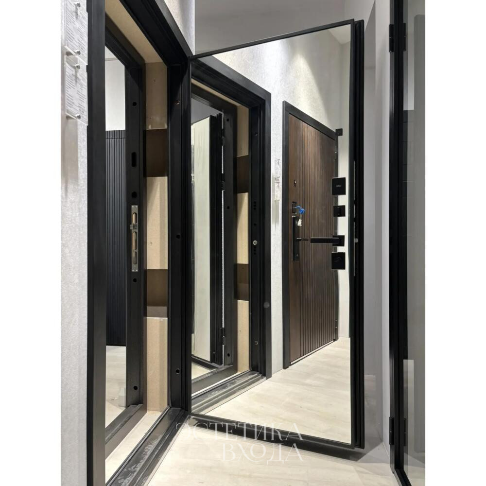 Входная дверь Абсолют с огромным зеркалом для квартиры. Выполнена в современном стиле, с необычной фрезеровкой. Черная фурнитура добавляет максимализм этой модели. Образец установлен на Селезнева 89.