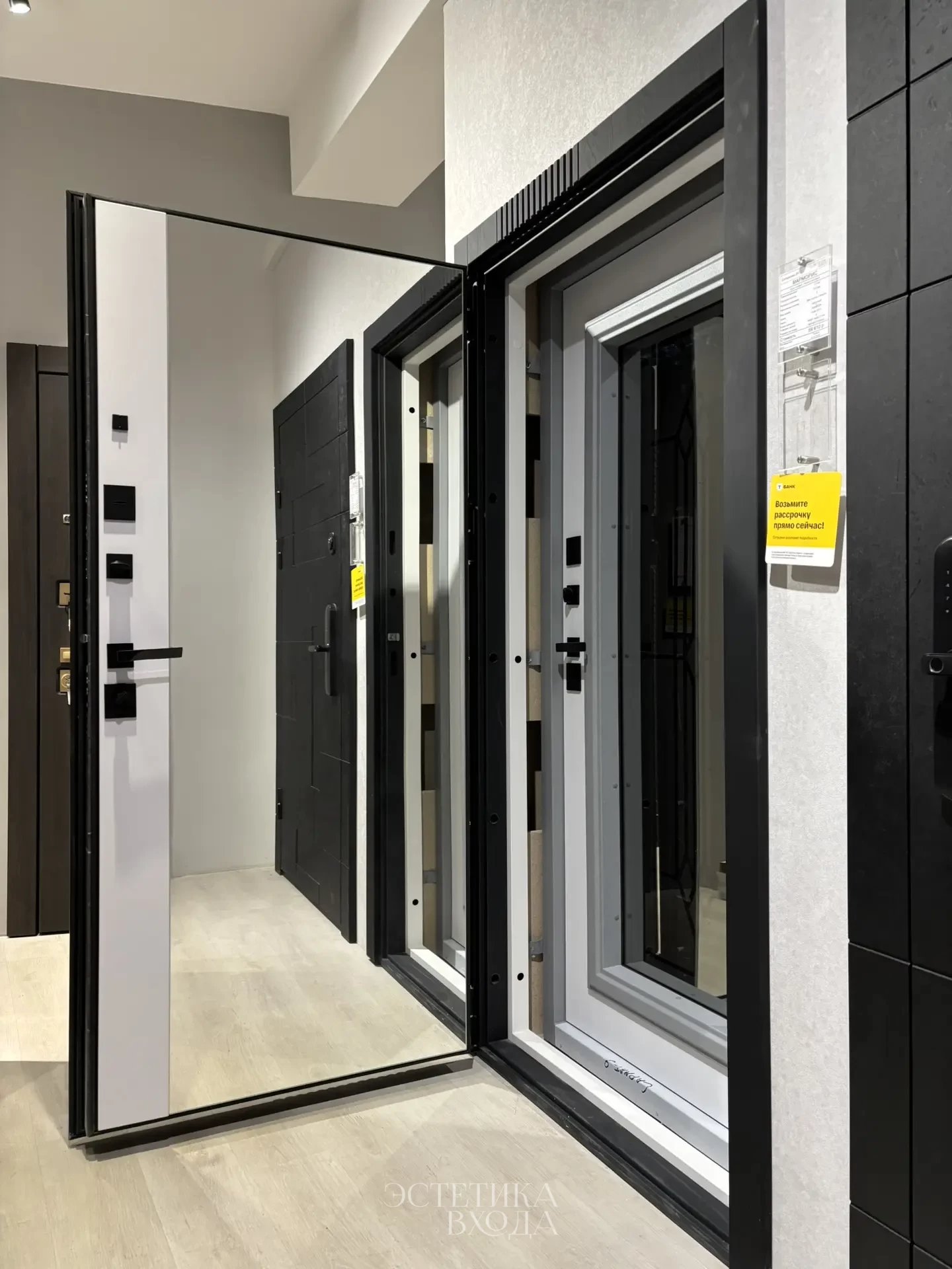 Входная дверь Марморис зеркало с белым коробом внутри. Образец установлен на Селезнева 89.