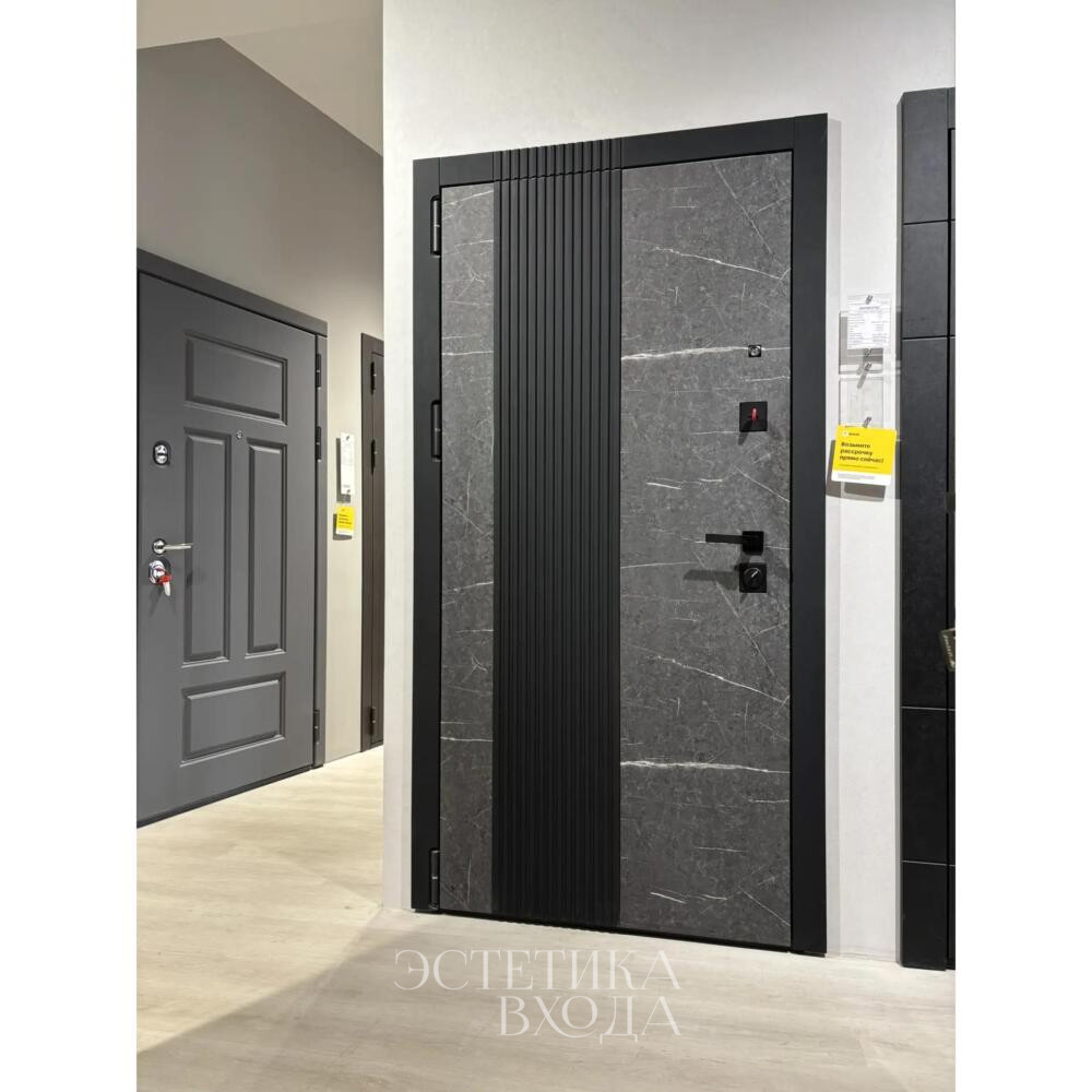 Марморис Зеркало витринный образец 960 левая .Вот она, страж домашнего очага – входная дверь. Снаружи – брутальная элегантность: MDF-панель цвета серого бетона, рассеченная строгими черными рейками. Этот индустриальный мотив словно говорит о надежности и неприступности, о твердом характере хозяев. Она молчаливо выдерживает натиск непогоды, шум улицы и любопытные взгляды.