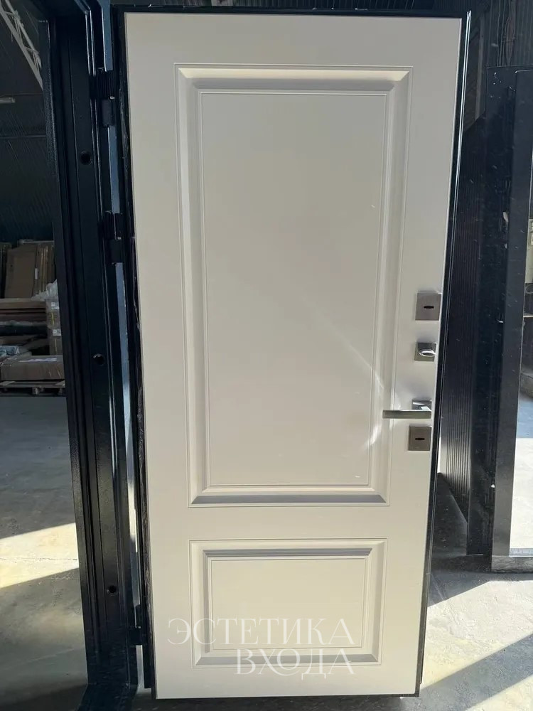 Внутренняя же сторона двери, напротив, излучает тепло и уют благодаря светлой МДФ панели. Белый цвет, выбранный для внутренней отделки, наполняет прихожую светом и визуально расширяет пространство. Рисунок фрезеровки, повторяющий мотив внешней стороны, создает гармоничное единство между экстерьером и интерьером.