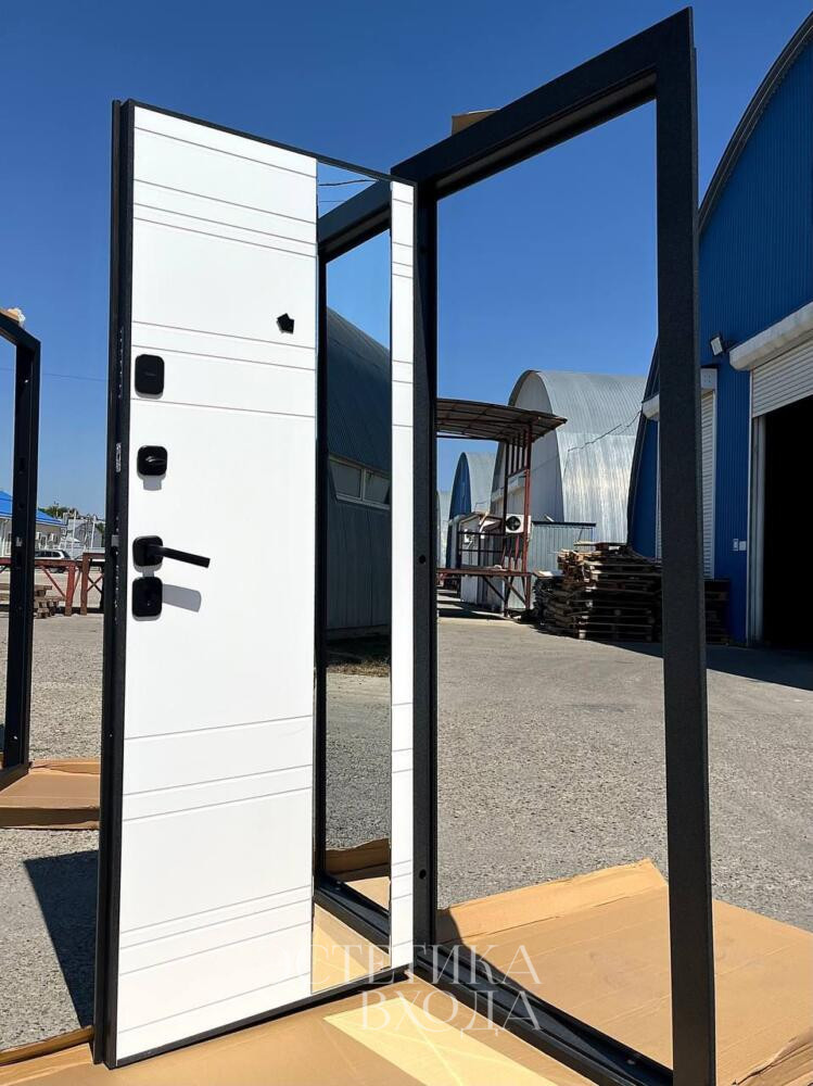 Входная дверь, словно портал в личное пространство, встречает взгляды изысканным сочетанием строгости и уюта, лаконичная ровная панель выполнена в металле , внутри мдф панель в белом матовом цвете , притягивающий внимание своей лаконичностью и классикой . Строгая и минималистичная внешняя панель вносит акцент , смягчая монохромную графику.