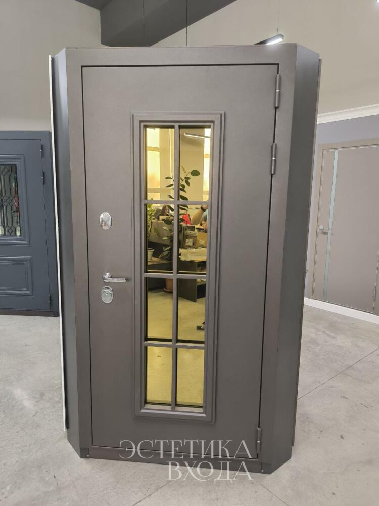 Снаружи дверь облачена в прочный коричневый металл, устойчивый к любым погодным условиям. Элегантный стеклопакет с английской решеткой пропускает мягкий свет, создавая уютную атмосферу в прихожей. Дополнительная створка в коричневом металле добавляет конструкции изысканности и функциональности.