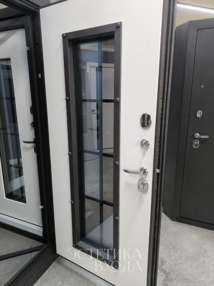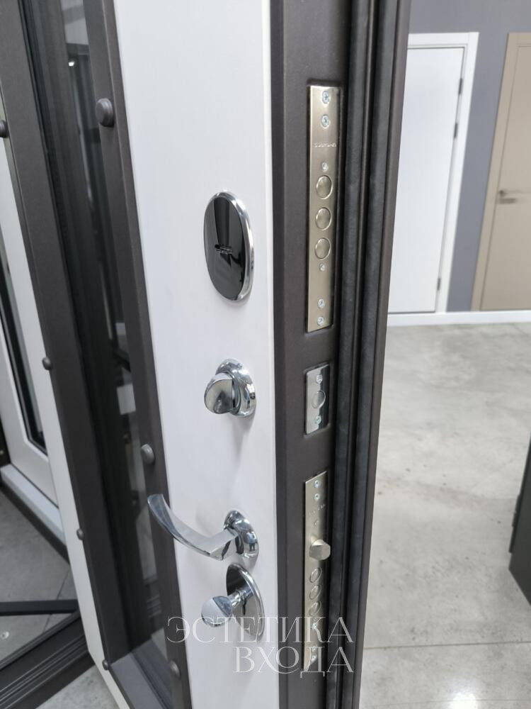 Внутренняя сторона двери отделана белой МДФ панелью, которая гармонично впишется в любой интерьер. В качестве утеплителя используется базальтовая плита, обеспечивающая высокую шумоизоляцию и сохранение тепла в доме. Благодаря терморазрыву, дверь надежно защищена от промерзания и образования конденсата. Закрытый и утепленный короб двери гарантирует дополнительную защиту от сквозняков и потери тепла.