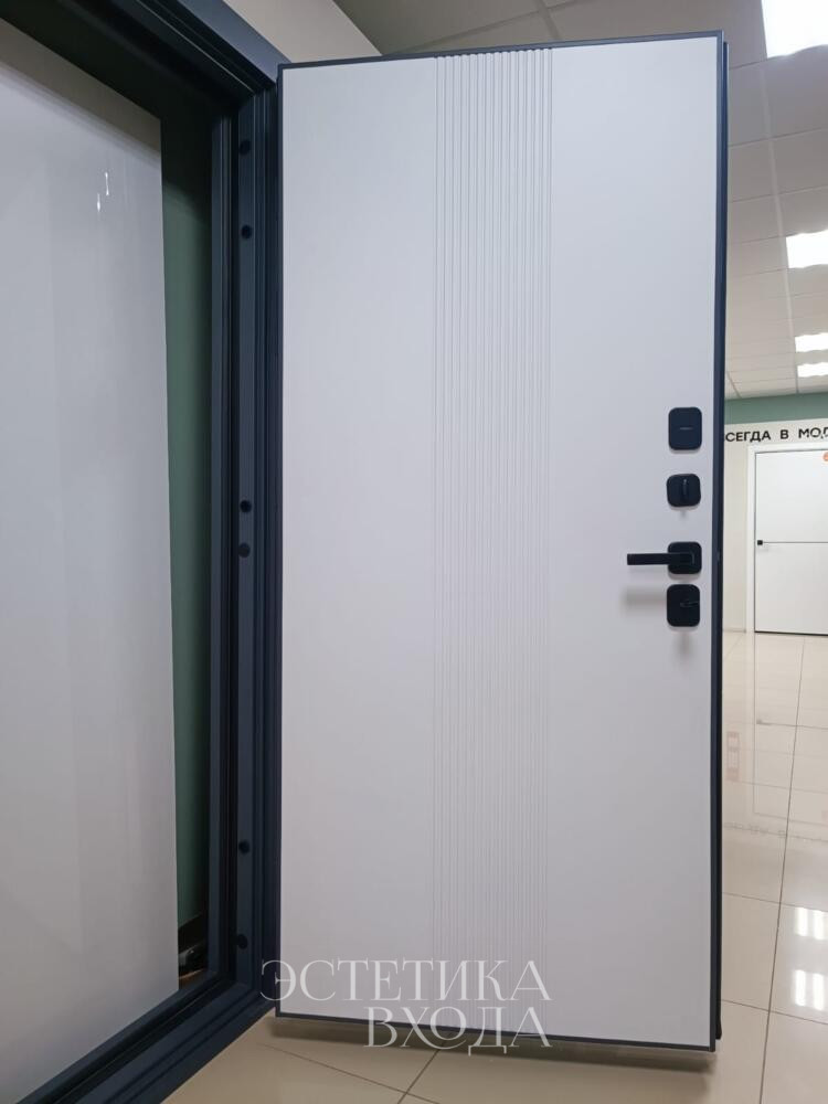 Внутренняя же сторона двери, напротив, излучает тепло и уют благодаря светлой МДФ панели. Белый цвет, выбранный для внутренней отделки, наполняет прихожую светом и визуально расширяет пространство. Рисунок фрезеровки, повторяющий мотив внешней стороны, создает гармоничное единство между экстерьером и интерьером.