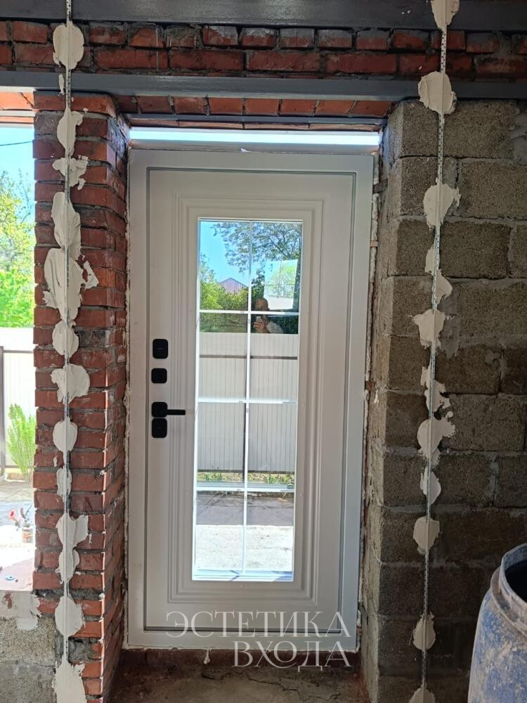 Гладкая поверхность металлической двери, лишенная малейшего изъяна, отражает солнечные лучи, создавая ощущение простора и света. В центре дверного полотна расположен стеклопакет, украшенный изящной английской решеткой. Этот декоративный элемент придает двери утонченный вид, напоминая о классической архитектуре и аристократическом вкусе.