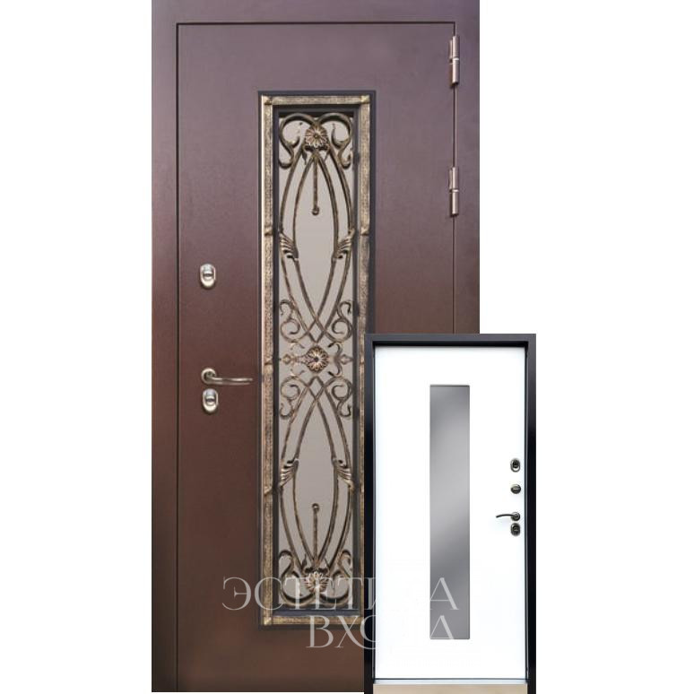 - Стеклопакет зеркальный, ковка снаружи стеклопакета, покрытие черный муар + патина золото