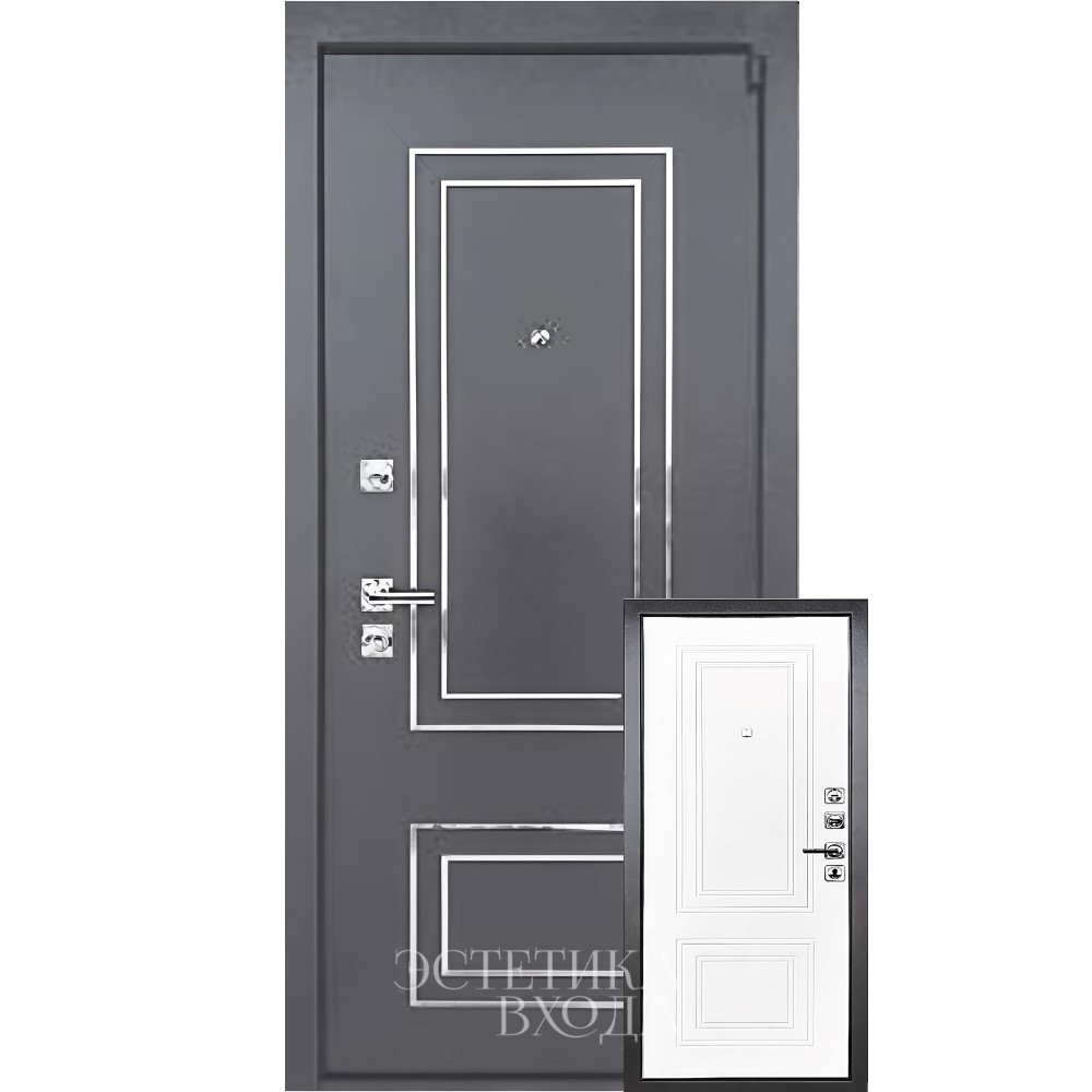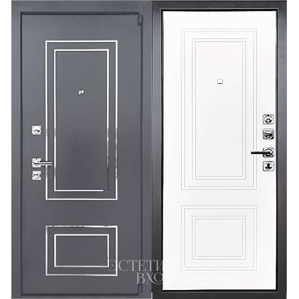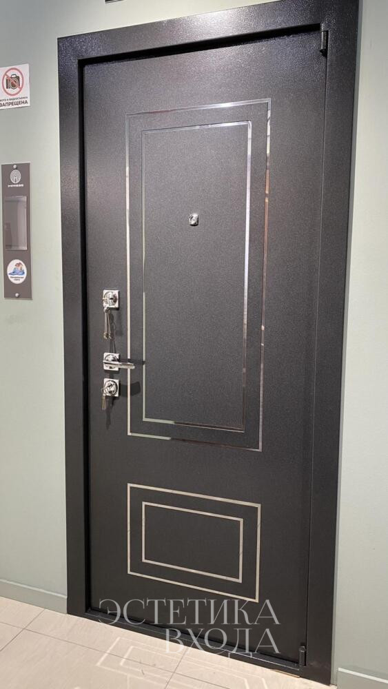 🚪Внешняя отделка выполнена в стильном графитовом оттенке с элегантными элементами из нержавеющей стали, что придаёт двери современный и респектабельный вид.