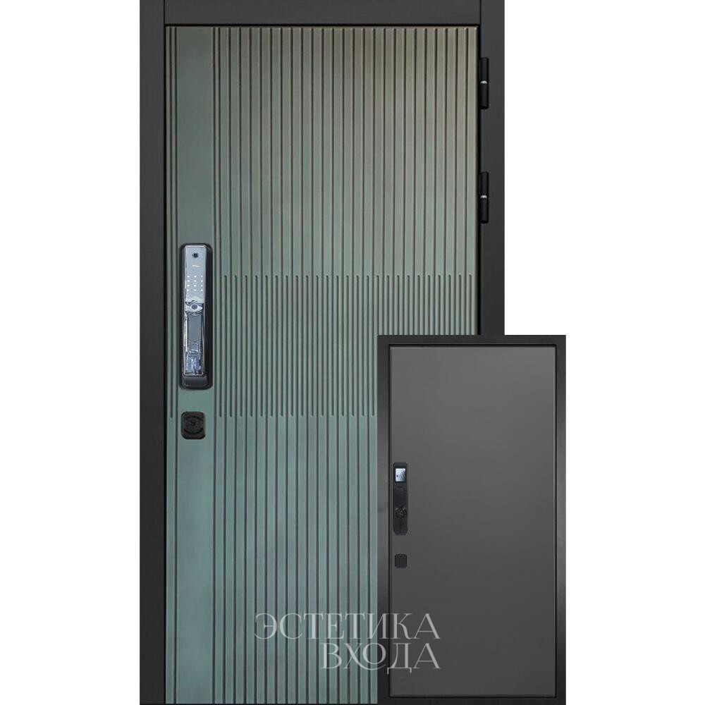Снаружи дверь имеет красивую внешнюю декоративную панель цвета Бирюза с черной патиной, которую эстетично дополняют МДФ-наличники в тон панели. Декоративная накладка с логотипом двери, как защита от подделок, расположена на торце дверного полотна.