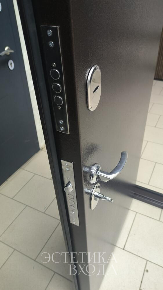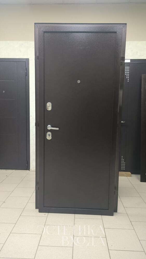 Снаружи дверь облачена в прочный металл темно серого цвета, устойчивый к любым погодным условиям. Дополнительная покрыта цинкогрунтом , защищающим от коррозии.