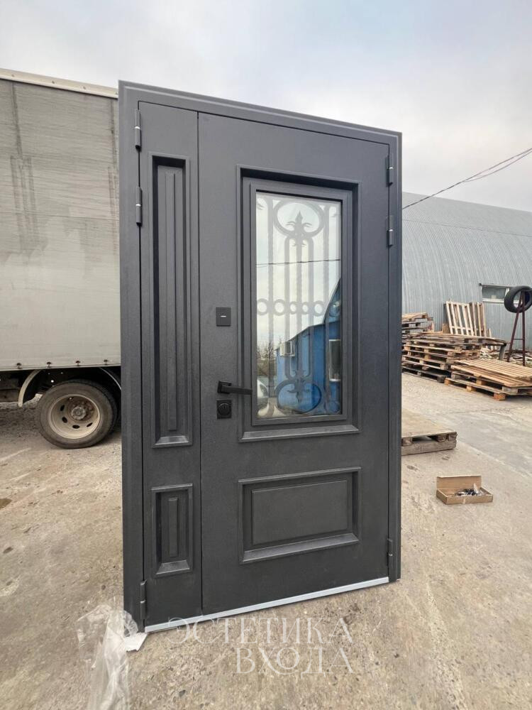 Уличная дверь со стеклопакетом и ковкой в размере 1200*2200мм в наличии от завода Феррони
