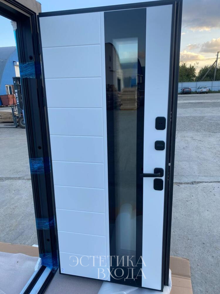 Внутренняя же сторона двери, напротив, излучает тепло и уют благодаря светлой МДФ панели. Белый цвет, выбранный для внутренней отделки, наполняет прихожую светом и визуально расширяет пространство. Рисунок фрезеровки, повторяющий мотив внешней стороны, создает гармоничное единство между экстерьером и интерьером.