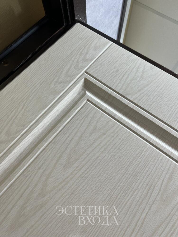Внутренняя же сторона двери, напротив, излучает тепло и уют благодаря светлой МДФ панели. Бежевый цвет, выбранный для внутренней отделки, наполняет прихожую светом и визуально расширяет пространство. Рисунок фрезеровки, повторяющий мотив внешней стороны, создает гармоничное единство между экстерьером и интерьером.