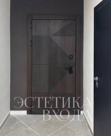 Входная дверь Мокко завода Бункер для квартиры. Выполнена в современном стиле, с необычной фрезеровкой в стиле геометрия.