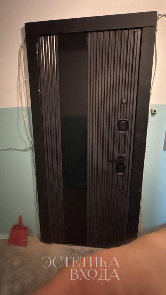 Входная дверь Тиана воплощает современную элегантность и передовые технологии. Снаружи строгая черная МДФ-панель с вертикальной фрезеровкой, создающая игру света и тени. В центре этой панели находится черное стекло, тянущееся во всю высоту двери, словно бездонный портал в неведомое.