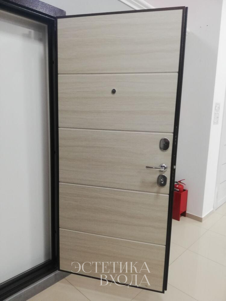 Внутренняя МДФ-накладка, в стиле модерн , придает двери элегантность и гармонично вписывается в интерьер подъезда. Внутренняя панель в цвете ларче шоколад придется по душе любителям интерьеров в древесных тонах .